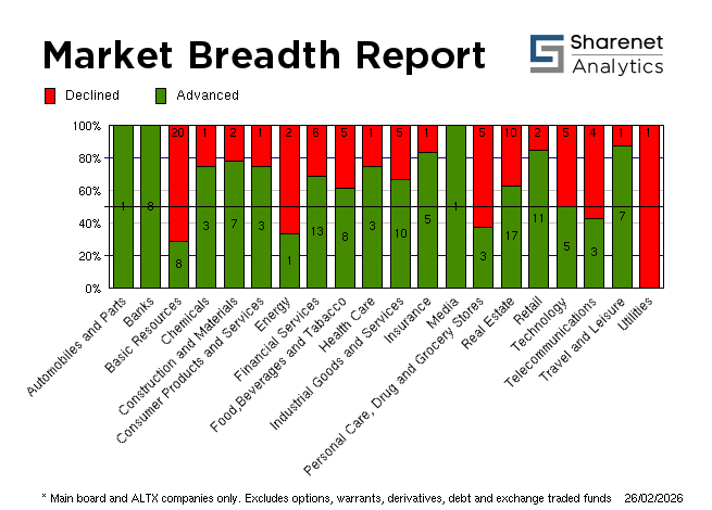 | 26/02/2026 | 236 | 144 | 28 | 408 | 245,939,881 | R26,942,597,761 | 393741 | 5728647 | | 25/02/2026 | 230 | 164 | 34 | 428 | 288,775,748 | R25,227,506,265 | 420680 | 3598568 | | 24/02/2026 | 183 | 244 | 37 | 464 | 225,018,222 | R20,788,308,650 | 318010 | 4511660 | | 23/02/2026 | 256 | 151 | 32 | 439 | 243,253,413 | R23,261,716,899 | 417238 | 5154007 | | 20/02/2026 | 190 | 178 | 25 | 393 | 248,659,101 | R23,098,757,851 | 308154 | 4476796 | * Includes all listed instruments on the JSE