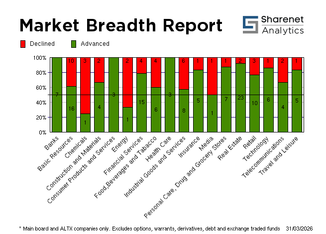 | 30/03/2026 | 226 | 215 | 30 | 471 | 322,434,032 | R28,226,294,017 | 416543 | 0 | | 27/03/2026 | 87 | 293 | 30 | 410 | 304,149,705 | R25,817,174,016 | 471056 | 0 | | 26/03/2026 | 141 | 230 | 36 | 407 | 253,318,890 | R24,980,347,120 | 378076 | 0 | | 25/03/2026 | 278 | 108 | 30 | 416 | 314,082,554 | R31,328,651,509 | 553223 | 0 | | 24/03/2026 | 258 | 169 | 32 | 459 | 314,918,951 | R29,423,508,383 | 460621 | 0 | * Includes all listed instruments on the JSE