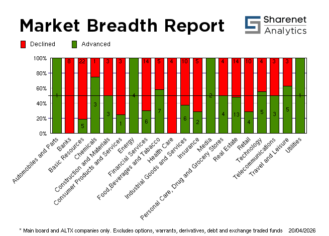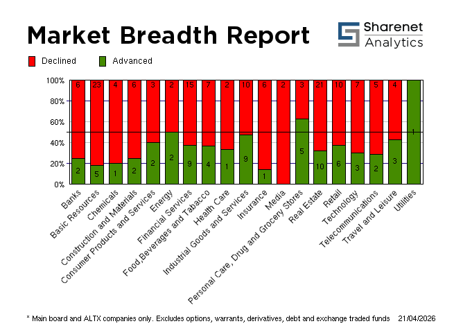 | 20/04/2026 | 182 | 206 | 26 | 414 | 259,334,467 | R18,150,233,214 | 315088 | 5316861 | | 17/04/2026 | 272 | 110 | 27 | 409 | 303,879,820 | R30,991,629,386 | 473886 | 5137509 | | 16/04/2026 | 223 | 166 | 32 | 421 | 215,704,495 | R21,581,191,749 | 306822 | 875897 | | 15/04/2026 | 229 | 145 | 29 | 403 | 258,479,450 | R24,693,782,837 | 387510 | 5693428 | | 14/04/2026 | 340 | 97 | 18 | 455 | 256,277,390 | R23,213,564,966 | 349778 | 2328587 | * Includes all listed instruments on the JSE
