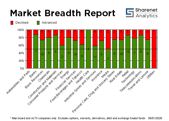 | 06/01/2026 | 309 | 127 | 31 | 467 | 241,746,573 | R23,199,104,709 | 395844 | 5493993 | | 05/01/2026 | 179 | 199 | 35 | 413 | 170,765,939 | R17,276,727,587 | 306322 | 4414580 | | 02/01/2026 | 181 | 180 | 32 | 393 | 148,107,452 | R10,319,082,178 | 179920 | 4014170 | | 31/12/2025 | 121 | 169 | 25 | 315 | 82,308,861 | R6,055,936,738 | 64859 | 672754 | | 30/12/2025 | 182 | 170 | 32 | 384 | 120,909,989 | R11,495,603,262 | 202639 | 3009415 | * Includes all listed instruments on the JSE