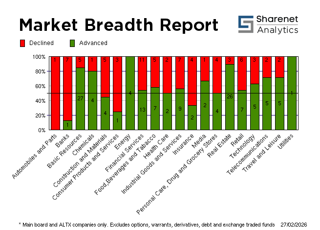 | 26/02/2026 | 236 | 144 | 28 | 408 | 245,939,881 | R26,942,597,761 | 393741 | 5728647 | | 25/02/2026 | 230 | 164 | 34 | 428 | 288,775,748 | R25,227,506,265 | 420680 | 3598568 | | 24/02/2026 | 183 | 244 | 37 | 464 | 225,018,222 | R20,788,308,650 | 318010 | 4511660 | | 23/02/2026 | 256 | 151 | 32 | 439 | 243,253,413 | R23,261,716,899 | 417238 | 5154007 | | 20/02/2026 | 190 | 178 | 25 | 393 | 248,659,101 | R23,098,757,851 | 308154 | 4476796 | * Includes all listed instruments on the JSE
